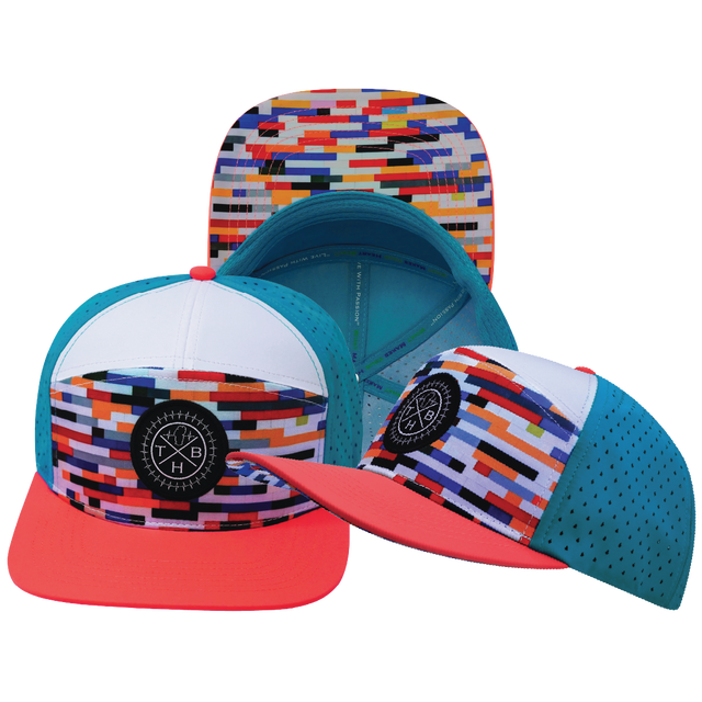 **YOUTH** THB - 7 Panel - Party Blocks - Neon Peach / White / Neon Blue - Laser Mesh (Unisex) is backordered and will ship as soon as it is back in stock.