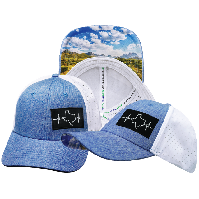 The Heartbeat Brand challenges you to "Live With Passion". You can show your love for Texas with our stylized 6 panel, shallow fit , pony tail hat design. Our designer collections have beautiful detail, and are some of the most unique hats around. Now ask yourself, What Makes Your Heart Beat?